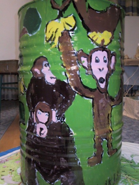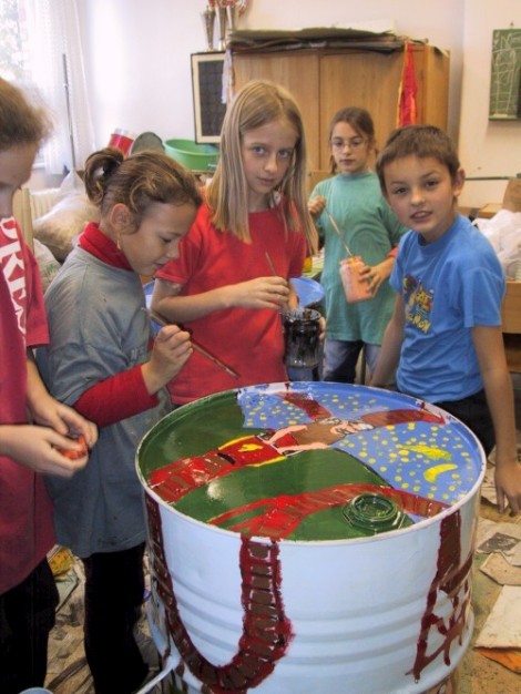 A pályázat témája a hulladék anyagok újrafelhasználása, „újraszépítése” volt. Az ilyen témájú pályázatok elég unalmasak számomra, ezért azon gondolkodtunk, hogyan lehetne új szemlélettel megközelíteni. Mivel régóta dolgozom gyermekekkel, próbálom magamban megfogalmazni, mi a titka annak, hogy sok gyermek képes együtt egy alkotást elkészíteni, és nekem ebben mi a szerepem. Izgalmas az a kérdés, hogy most műnek nevezem a gyermekmunkákat, pedig nem szokás. A szándékom az volt, hogy művet készítsünk a gyermekek közreműködésével, egy interaktív tevékenység során. Egy régi tervem, hogy az aula csarnokába a mennyezetig érő különféle vastagságú oszlopokat készítsünk, amelyek hengeres felületére a gyermekekkel képeket festünk (mint Trajánusz oszlopa). A vázlatokat megmutattam rajztanár kollégámnak, tőle származott „a hordó” gyakorlatias ötlete. Tartottam az olajfestéstől. Az eredeti ötletem papírmasé volt, amellyel a gyerekek könnyebben bánnak tapasztalataim szerint, de a „hordó ötlet” radikálisabbnak tűnt, a fémre pedig nem lehet másképp festeni.