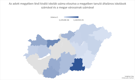 A legutóbbi grafikonból az is kiderül, hogy a kiváló iskolák száma nem feltétlenül azért olyan magas Pest megyében, mert ott jobban dolgoznak a tanárok, hanem azért, mert ott nagyobb a gyerekek száma és a városoké is. (Pl. Heves megyéhez képest ötször annyi tanuló és háromszor annyi város van Pest megyében.)