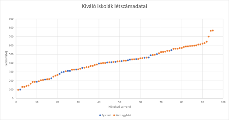 Különbségeket kerestem – az eredményeken kívül – a kiváló és nem kiváló iskolák között. Az egyházi és az „összes fenntartós” minta hasonló. A kiváló iskolák átlagosan nagyobbak, és tanulóik létszámához viszonyítva kisebb a hátrányos helyzetűek aránya.